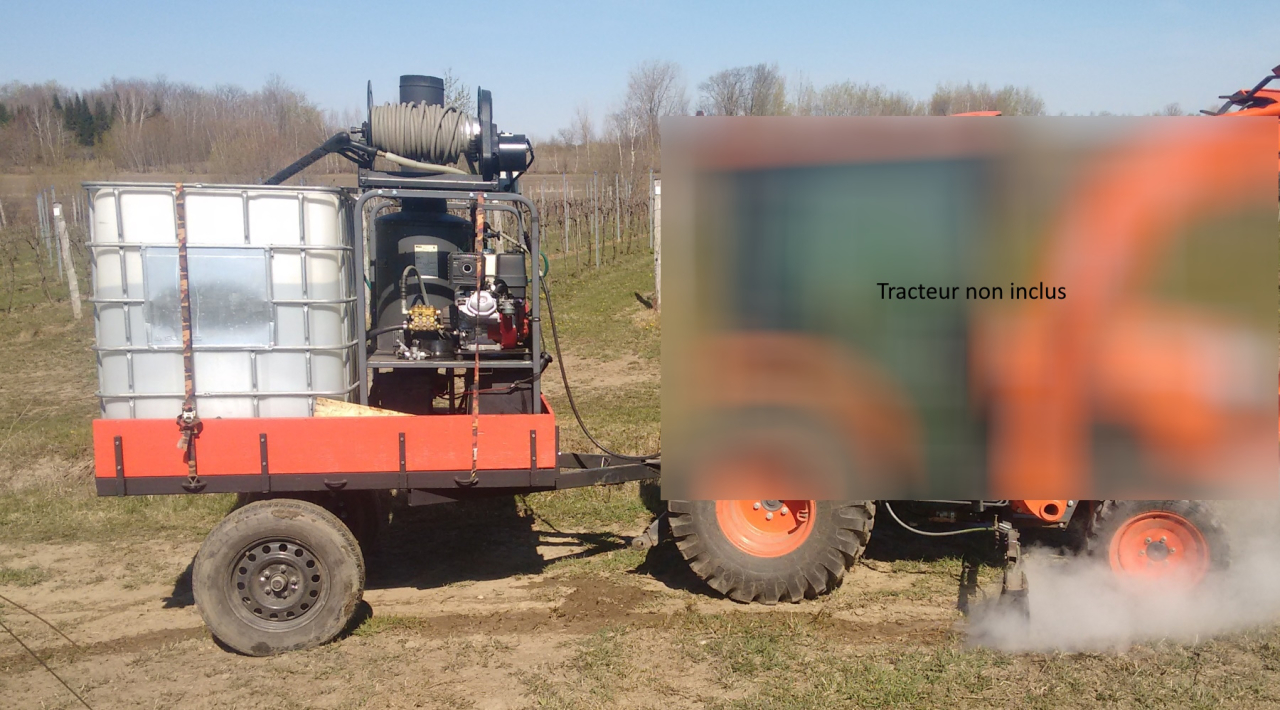 Désherbeur thermique à eau chaude pour culture en rangées (vignoble, verger, pépinière) avec réservoir, remorque et rampes d'application des 2 cotés. Fabrication domestique basée sur le désherbeur à eau chaude Geyser de MS Gregson. Modifié pour être autonome au champ (réserve d'eau 1000 litres) monté sur une remorque et avec ajout de rampes de pulvérisation de chaque cotés du tracteur avec ajustement de la largeur variable et valves électriques pour fermer l'une ou l'autre des rampes au besoin. Un équipement unique et très efficace (voir photos 24, 48 et 72 heures). Idéal en production biologique. Permet aussi d'avoir une station de lavage sous pression mobile (froide ou chaude). Tracteur non compris.