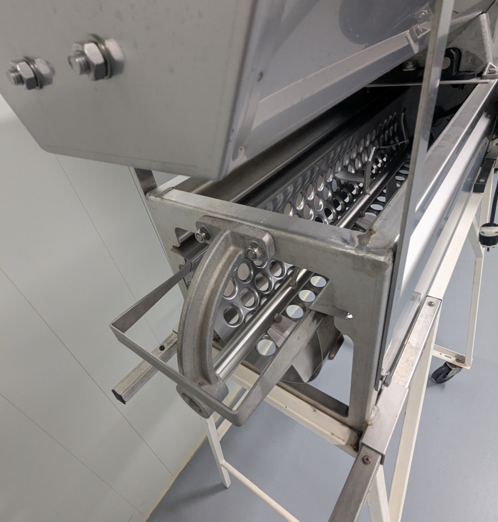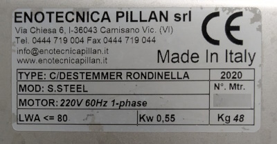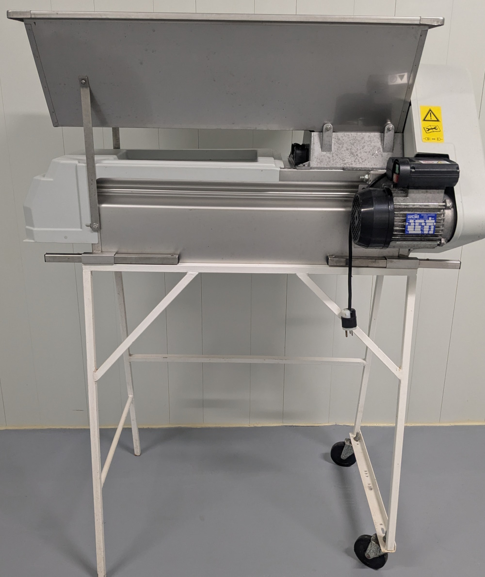 Mini égrappoir fouloir Rondinella en inox (acheté neuf chez Elnova en 2020), presque neuf (utilisé moins de 10 heures). Capacité environ 2,2 tonnes/heure. Support à roulette inclus.